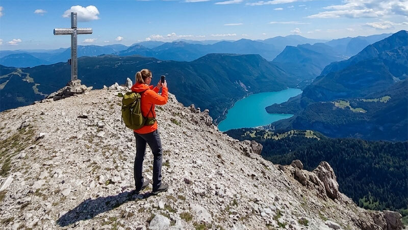 Ekipa trekkingowa ruszy szlakiem 405 aby nieco okrężną i łatwiejszą trasą zdobywać wysokość. Następnie zmiana na szlak 404A, by na kolejny skrzyżowaniu wejść na 404. Na tym jednak nie koniec nawigacji, potem jeszcze szlak 413 i na koniec 418. Końcowy odcinek do szczytu Cima Sat 1245m prowadzi krótkim fragmentem ubezpieczonym stalową linką (trudność A/B) oraz odcinek ostro 15m na szczyt z klamrami i liną, które trzeba będzie pokonać w dwie strony. To tzw. "straszne kropki" ;) Kto będzie się czuł na siłach, to pokona te odcinki w obu kierunkach. A dla kogo kropki będą zbyt straszne, to ominie szczyt, a kontynuując trasę szlakiem 418 i tak będzie miał super widoki na Jezioro Garda.