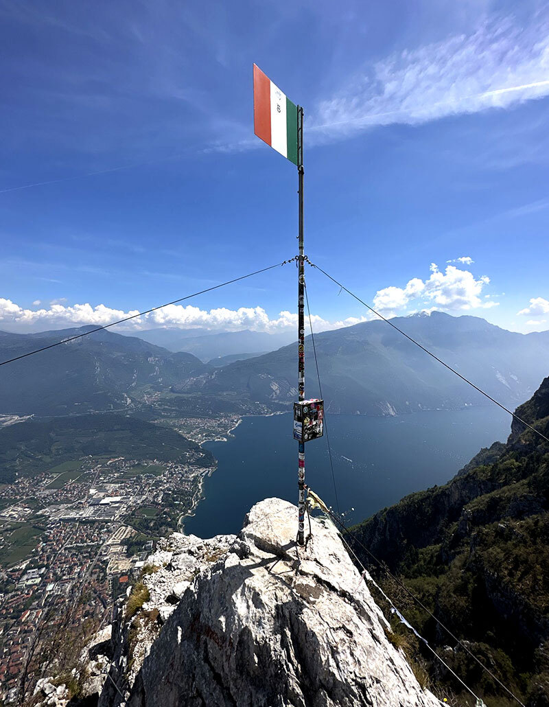 Ekipa trekkingowa dalej szlakiem 417 do 460 i dotarcie do schronu Bivacco Arcioni - przy nim krótki piknik z widokiem na J.Garda, a następnie szlak podejściowy na szczyt 🏔️Cima Rocca 1090m, miejscami ubezpieczenia z linami stalowymi, tunele w skałach (konieczne czołówki!) - by na szczycie zachwycać się spektakularnym widokiem na położone w dole J.Garda.
